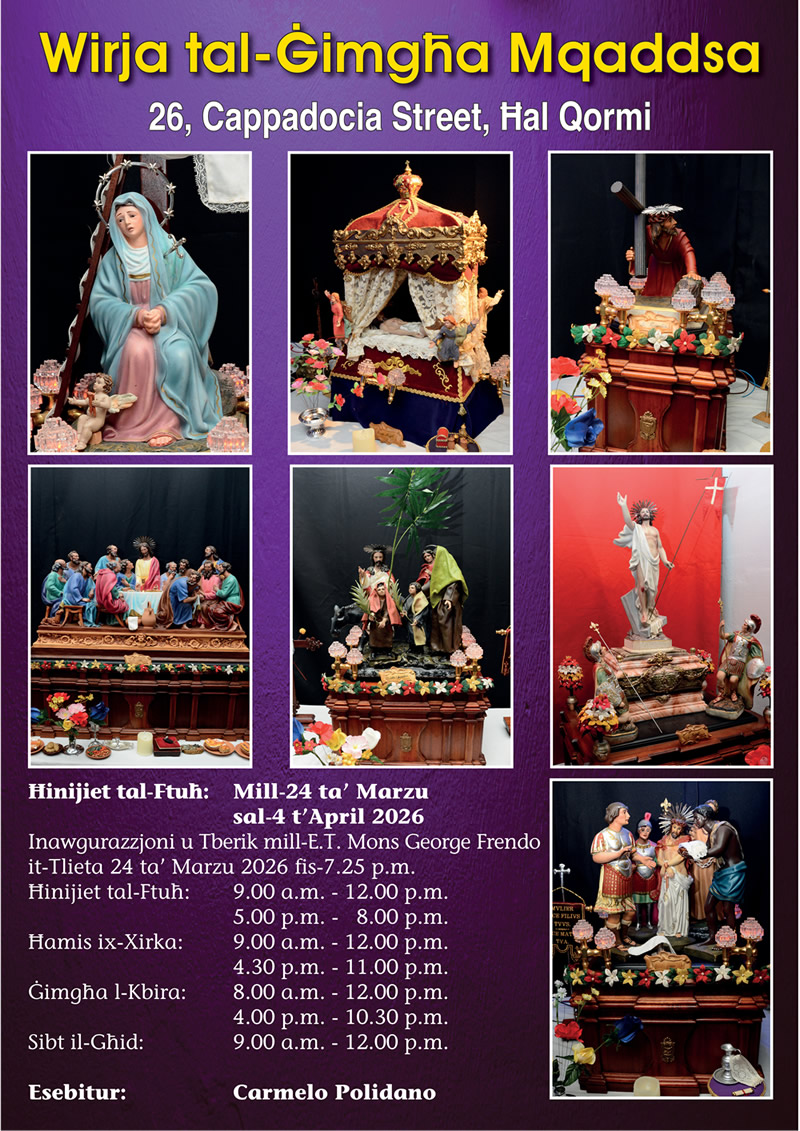 | Insellmilkom, Għal darba oħra erġajna qegħdin fir-Randan Imqaddes u għalhekk mill-ġdid qed nerġa' niltaqa' magħkom permezz ta' dan il-ħsieb f'din il-Website. Iż-żmien tar-Randan Imqaddes m'huwiex biss żmien ta' sagrifiċċju biex fih nippreparaw ruħna kif jixraq għall-Għid il-Kbir, iżda huwa wkoll żmien li fih naħsbu u nirriflettu aktar kemm ħabbna l-Mulej. Biex tkompli ddaħħalna fl-ispirtu ta' dan iż-żmien u tgħina nirriflettu aktar fuq l-Akbar Imħabba li biha ħabbna Alla l-Missier qiegħed nerġa' ntella' Wirja tal-Passjoni, il-Mewt u l-Qawmien mill-Mewt ta' Sidna Ġesu' Kristu bl-isem ta' "l-Ikbar Imħabba" li tikkonsisti mhux biss fi' Statwi imma wkoll f'diversi simboli konnessi ma' dan iż-żmien qaddis. Din il-Wirja għandha tgħina wkoll nidħlu aktar fl-ispirtu ta' dan iż-żmien ta' riflessjoni aktar mis-soltu dwar din l-imħabba kbira li biha ħabbna Alla li bagħat lill-ibnu l-waħdieni biex jieħu l-Mewt għalina biex isalvana mid-dnub. Għax biex jinħafer id-dnub tad-dinja w aħna niġu mifdija mid-dnub, Ġesu' Kristu tant ħabbna li ried jagħmel ir-rieda ta' Alla l-Missier u jieħu l-mewt l-iżjed ħarxa l-Mewt tas-Salib. Nawgura l-Għid it-tajjeb lil kulhadd